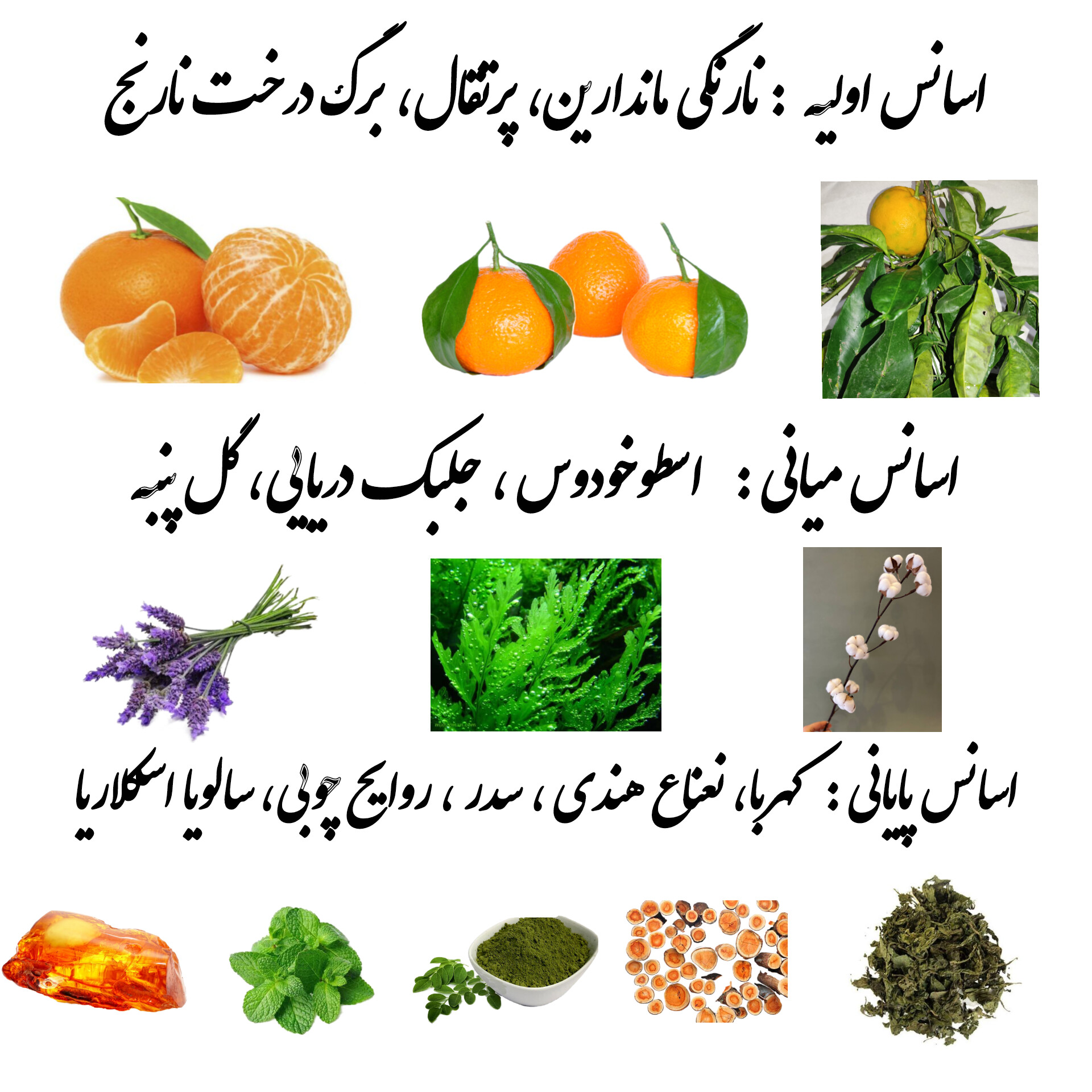 اسانس اولیه : نارنگی ماندارین، پرتقال، برگ درخت نارنج.