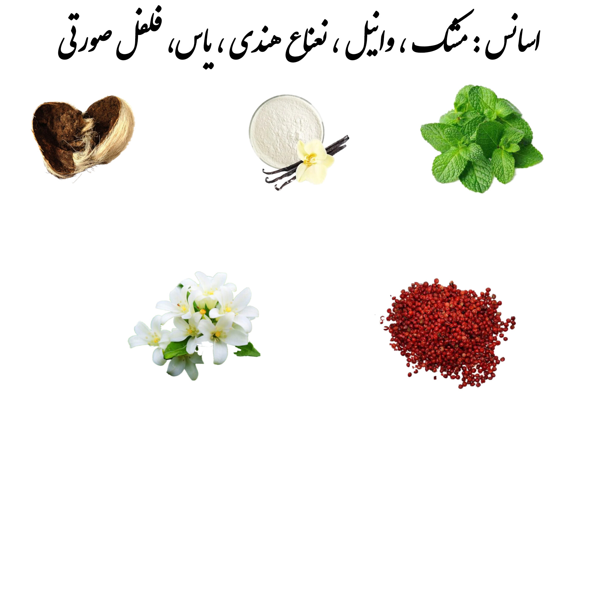 اسانس اولیه : مشک ، وانیل ، نعناع هندی ، یاس، فلفل صورتی.