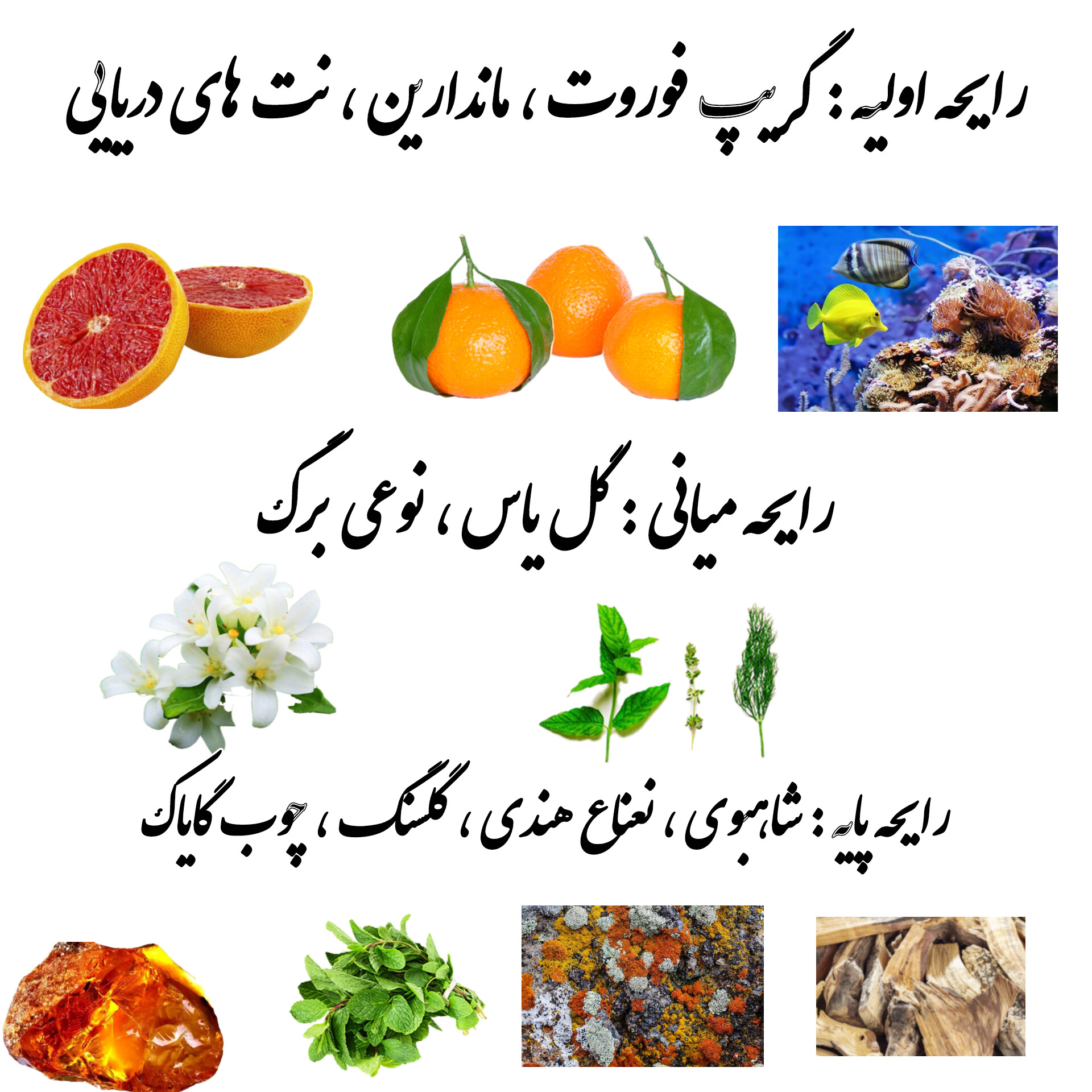 رایحه میانی : گل یاس ، نوعی برگ.