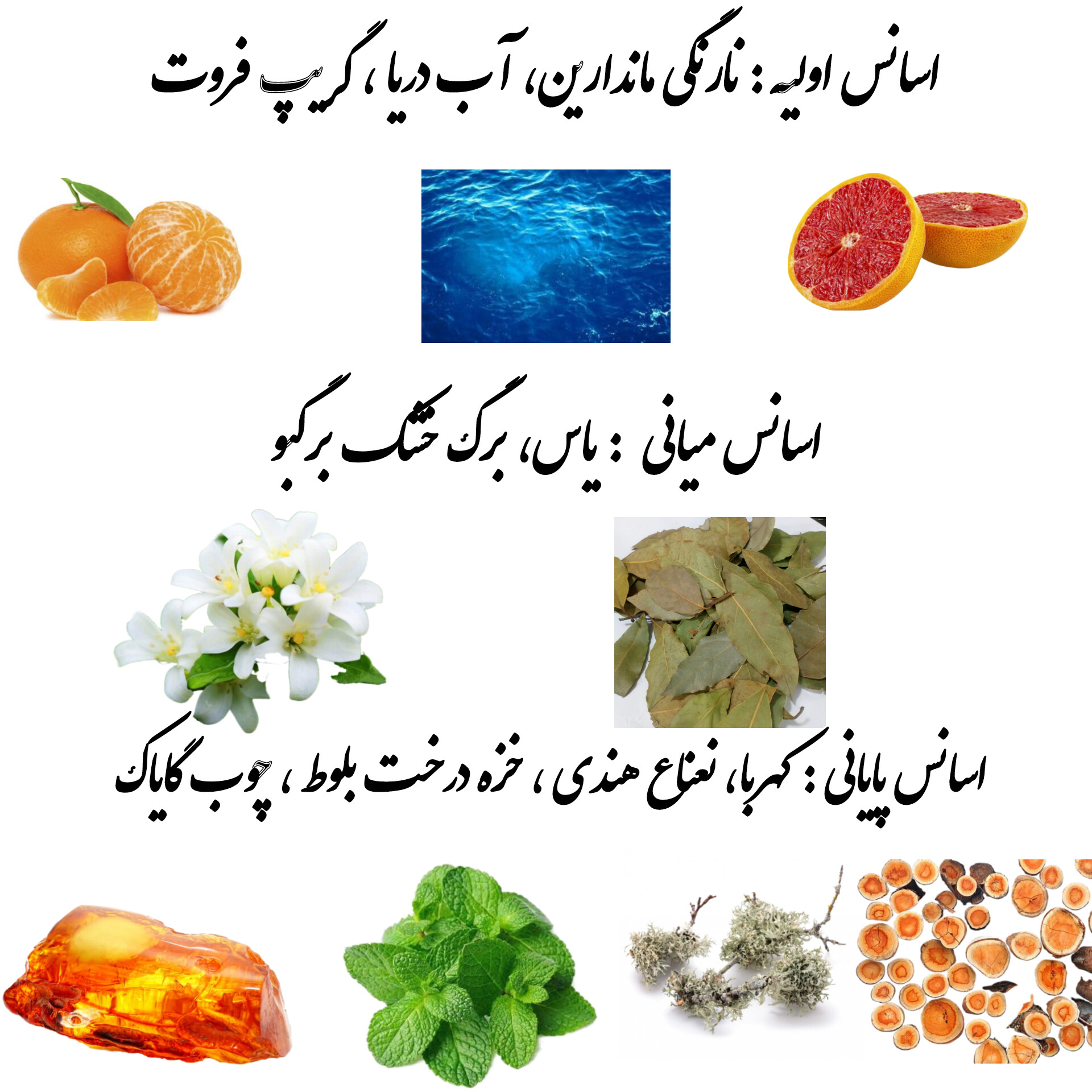 اسانس پایانی : کهربا، نعناع هندی ، خزه درخت بلوط ، چوب گایاک.