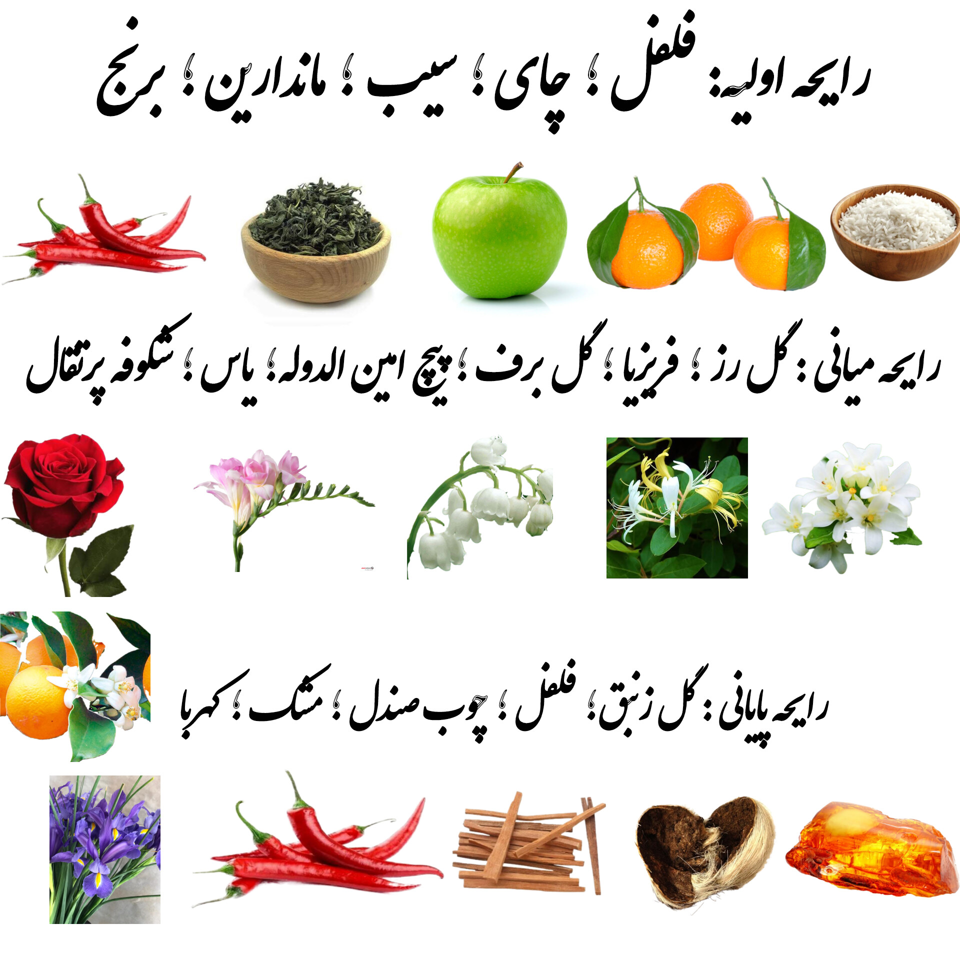 اسانس اولیه : نارنگی ماندارین، سیب ، فلفل ، چای ، برنج.